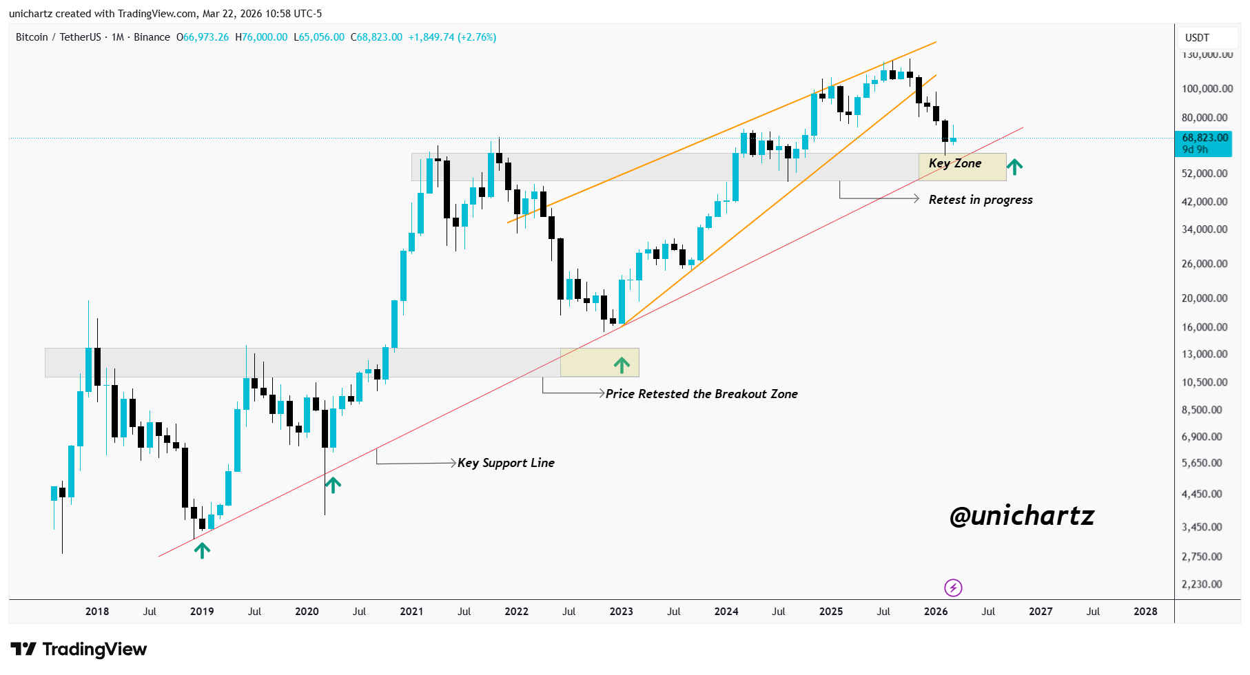 Around $68,000, Bitcoin is currently retesting a significant breakout zone that has switched from resistance to important support.