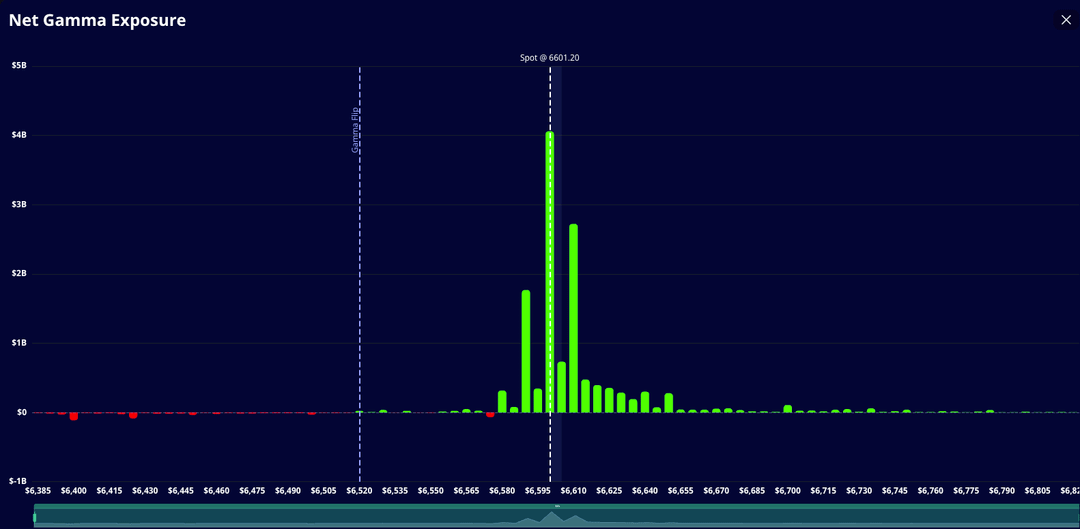 Red bars (negative GEX) below $6,520 Small but present. Confirms the flip zone is real, not just a line on a chart.