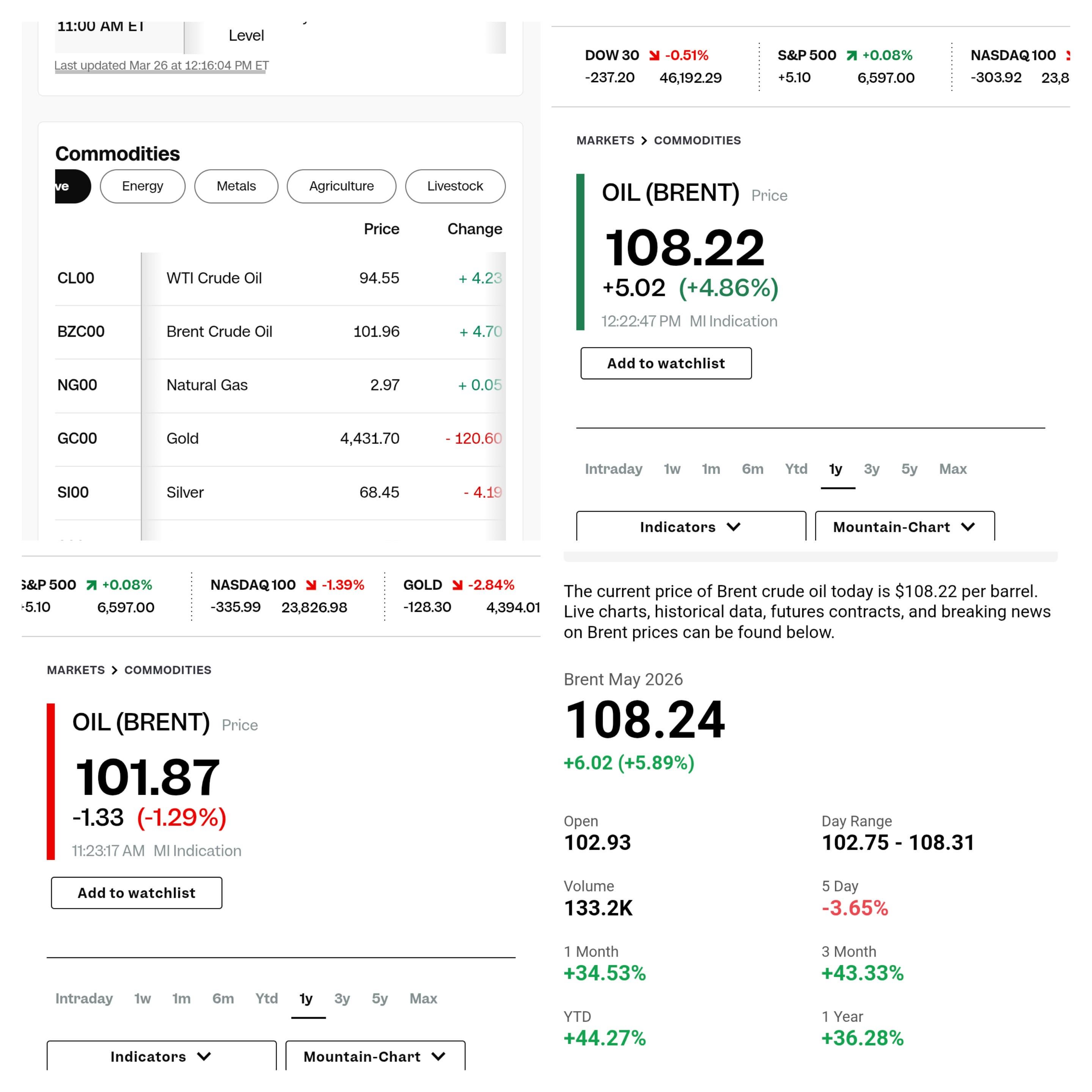 None of these are going to right. The all come from different sources and none of these are real time. The exchange websites are good but clunky. CNBCs CL1 (the front month, currently for May 1 delivery) would be more current but still delayed. I use investing.com’s app because while not perfect, it’s a better representation of the price and order flow in real time.