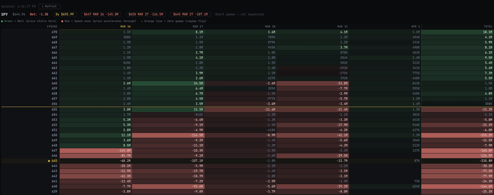 Built a gamma exposure heatmap that visualizes dealer positioning across every strike and expiration. Here's what SPY looked like heading into today's session.