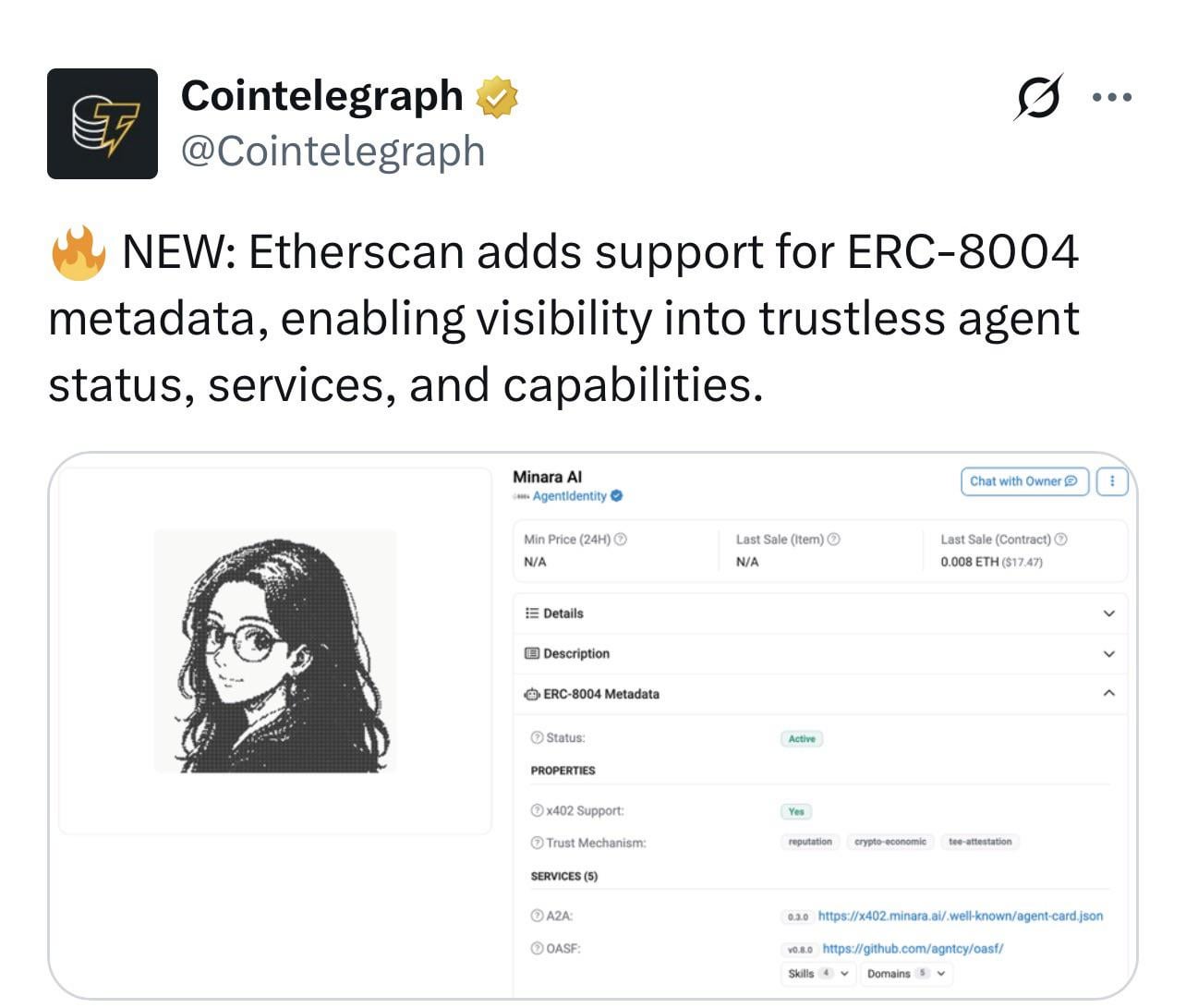Etherscan adds support for ERC-8004 metadata, enabling visibility into trustless agent status, services, and capabilities https://i.redd.it/ne3tdwfkwkrg1.jpeg Posted by Creative_Ad7831