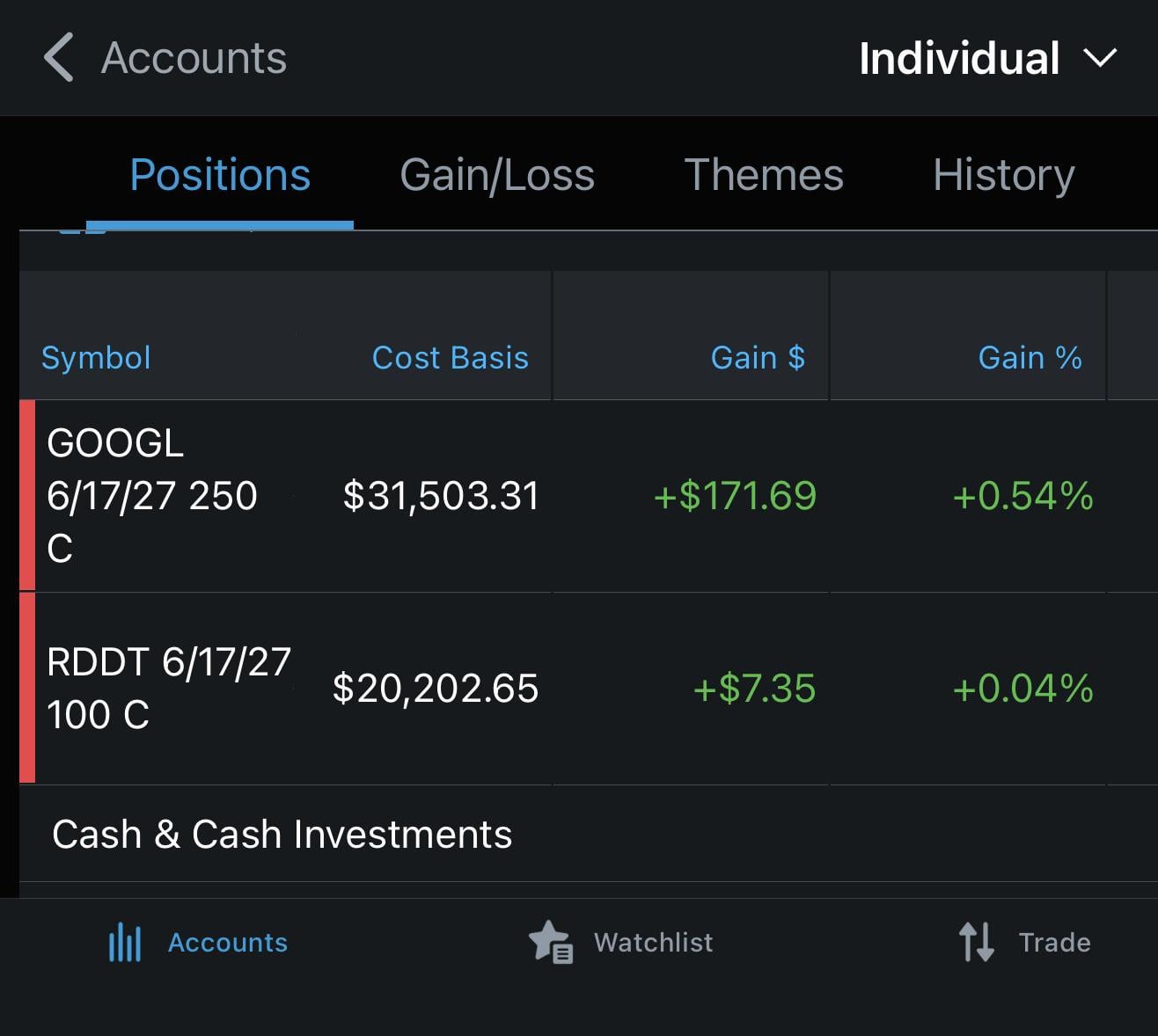 Bought some calls on Google. I am 100% convinced that Mr. Market is run by people who are clueless about the demand for AI and think it is a bubble. They think it is a glorified search engine that can make pictures and AI slop videos. Meanwhile in my business I am finding use cases for every job we do and with each use I am finding even more ambitious uses for it. It is like having a personal team of programmers that I never had that can actually make something that works how I want it.