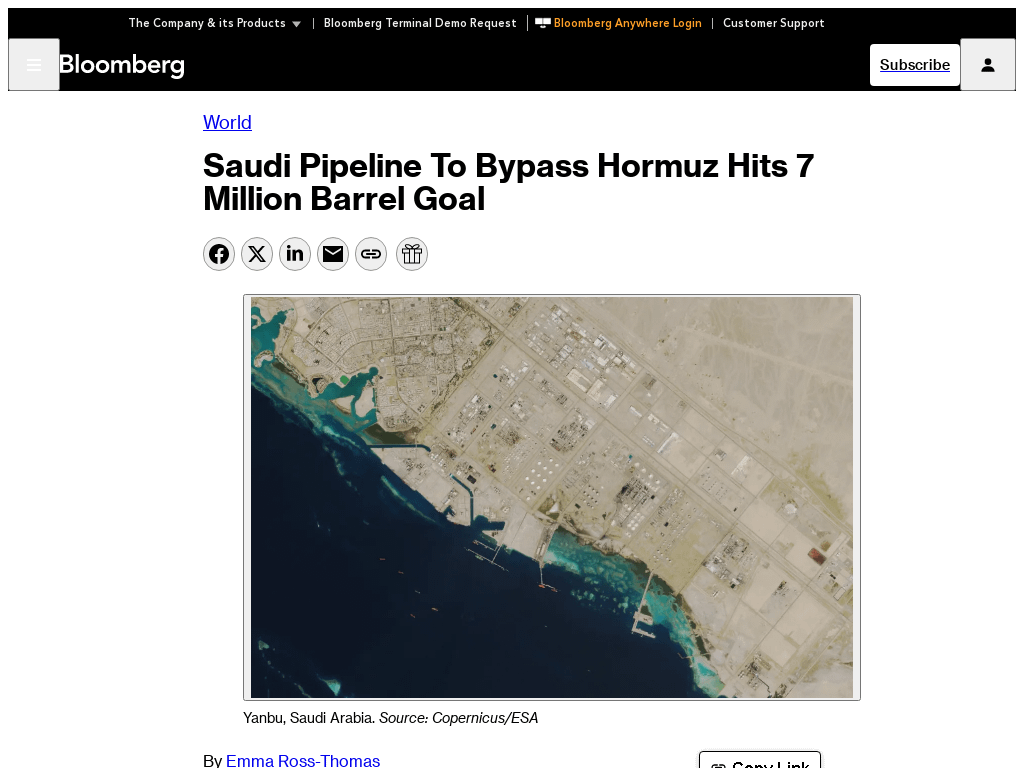 Saudi Arabia’s crucial East-West pipeline that circumvents the Strait of Hormuz is pumping oil at its full capacity of 7 million barrels a day, according to a person familiar with the matter.