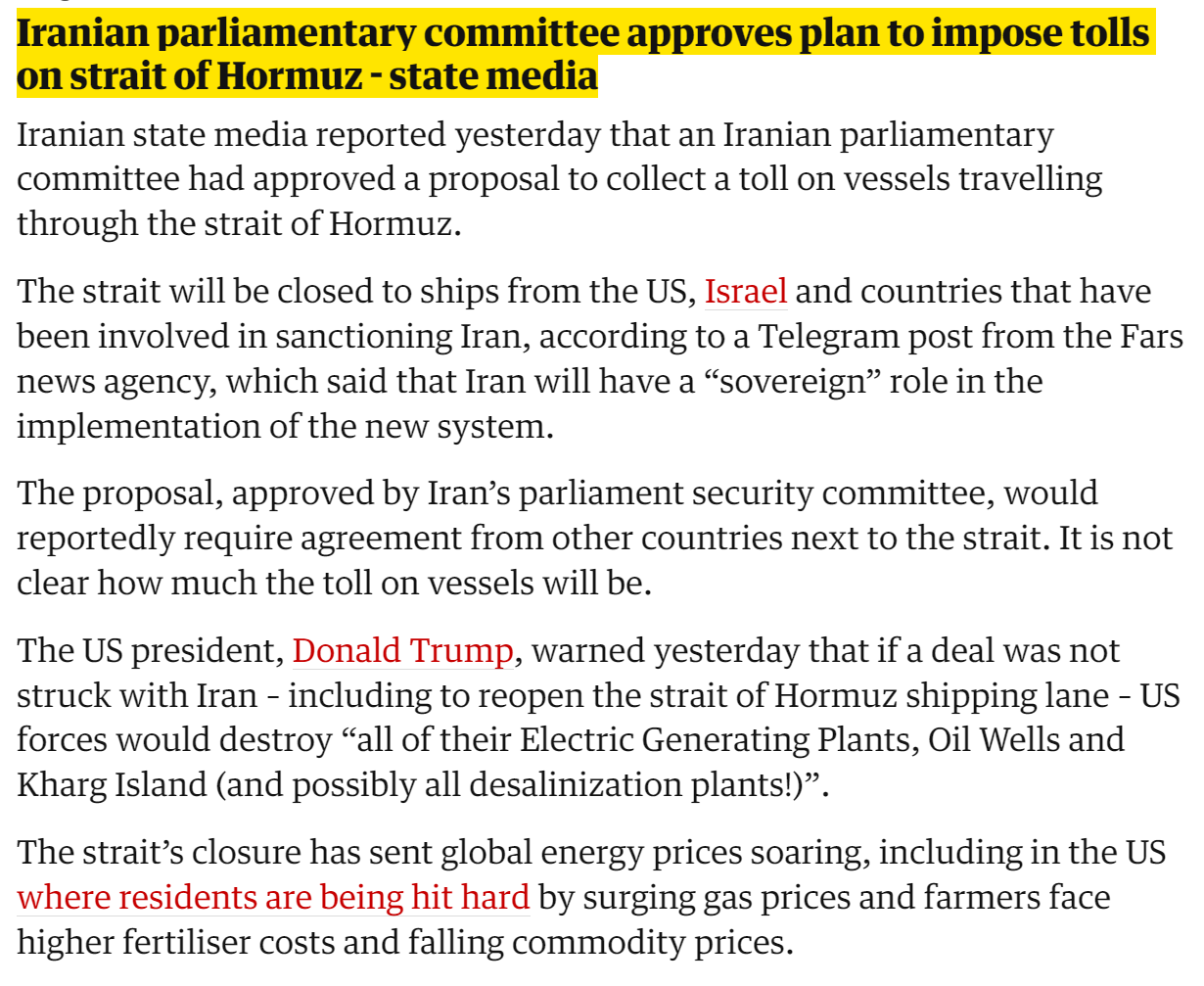 I mean, Donald is surely not imposing global tariffs, right ? Iran are in the right to impose a tariffs on whoever they want I think ? And I tend to believe Iran will only penalize/impose tolls on countries who attack them first.. isn’t that what they said their plan was ?