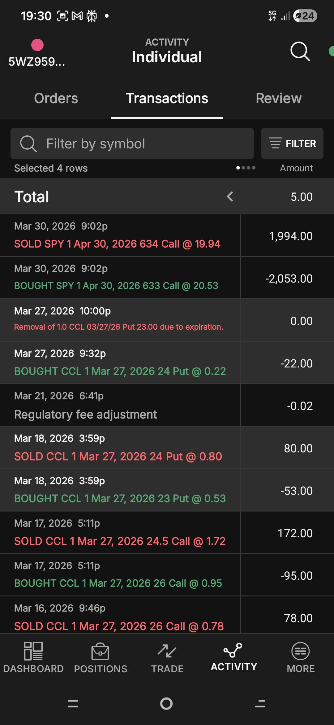 On Mar 18, I opened a bull put credit spread on CCL expiring Mar 27: Sold 24P, bought 23P protection (net credit received = 27). Expected max profit if CCL stayed >24 at exp.