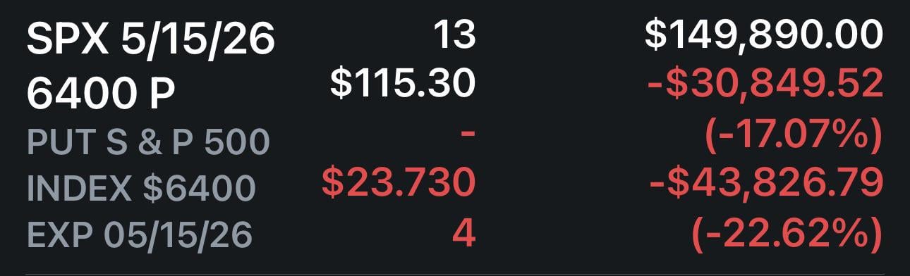 Down $43k on SPX puts and still calling it “a thesis.” At this point I’m not trading, I’m funding market confidence.