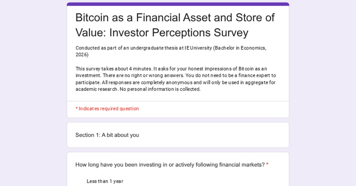 Hi all, I'm a final-year Economics student writing my thesis on Bitcoin as a maturing financial asset. I'm analyzing returns, volatility, and tail risk from 2016 to 2026, and I need retail investors' perspectives to complement the quantitative data.