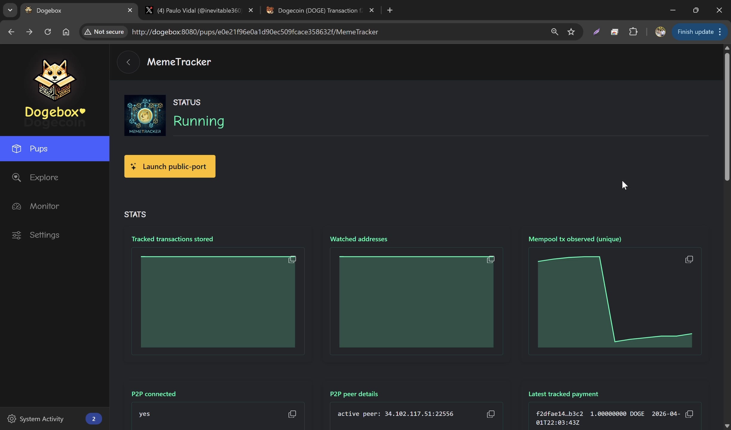success! Dogecoin MemeTracker (mempool), fully functional on Dogebox OS, tracking any dogecoin address you sent to him and will start tracking any payment sent in seconds (~3 seconds) if any is sent will reply to you with all transactions ID's and amounts 🙂