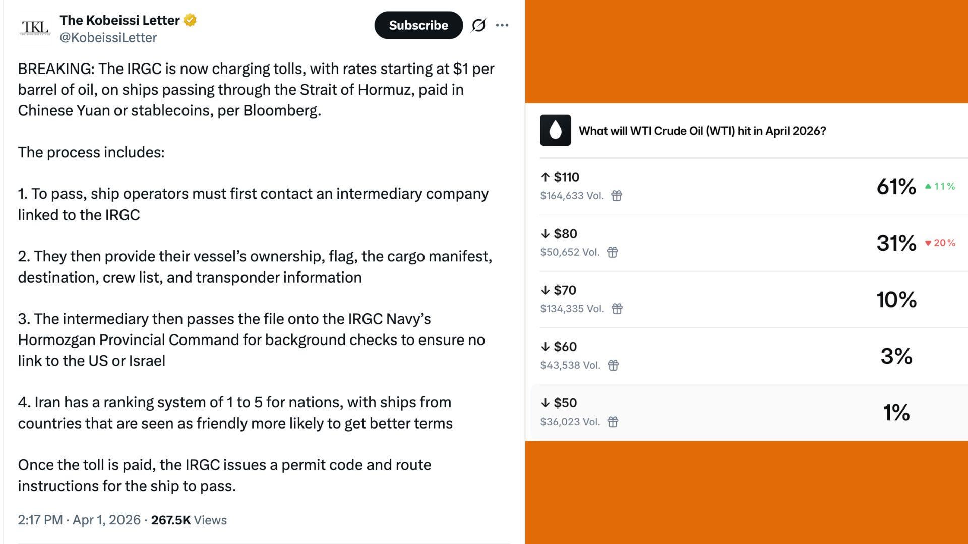 IRGC begins charging tolls in the Strait of Hormuz; Market odds for $110 WTI Crude jump to 61%.