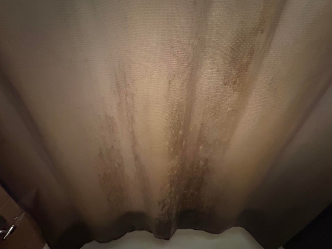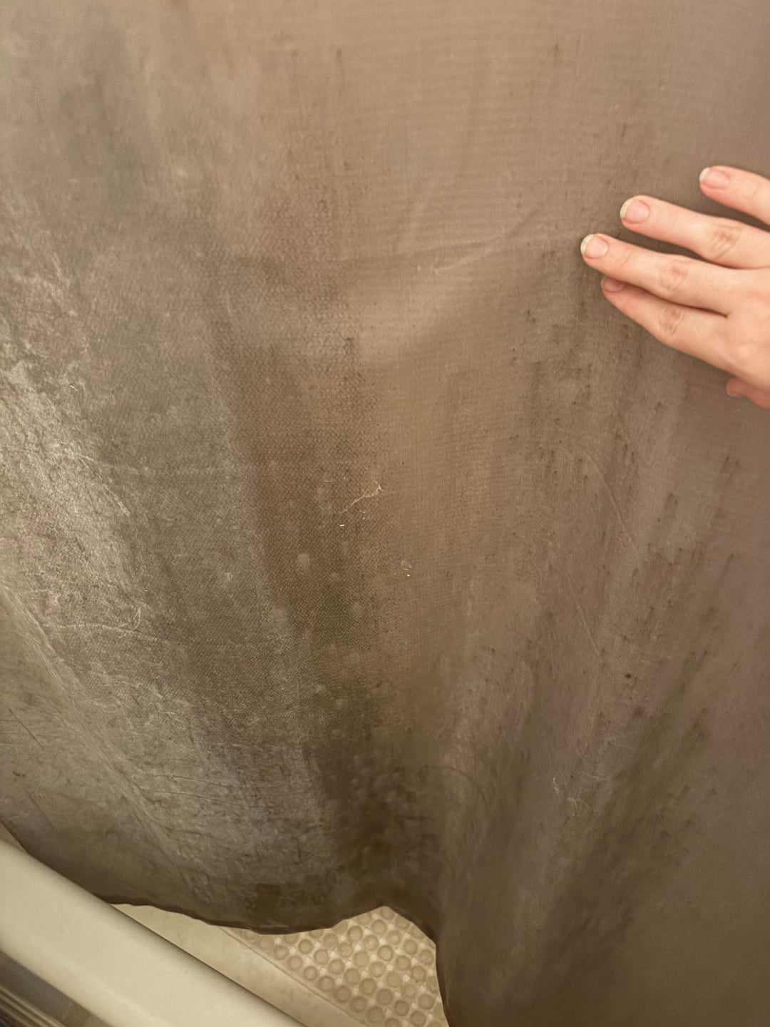 So I’m an adult but living with my parents for the time being, I’m wanting to clean this curtain, I know they should toss it and get a new one but it’s not my house so I don’t want to toss their things. Its this gray plasticky fabric and liner, I also just realized I think they have it on backwards. Is there a way to get rid of or mitigate the stains, I’m uncertain I cant use bleach because of the “fabric” and color of it. First two photos sho the material, a the last two show the side not facing the shower(but should be) and the inside of the shower.