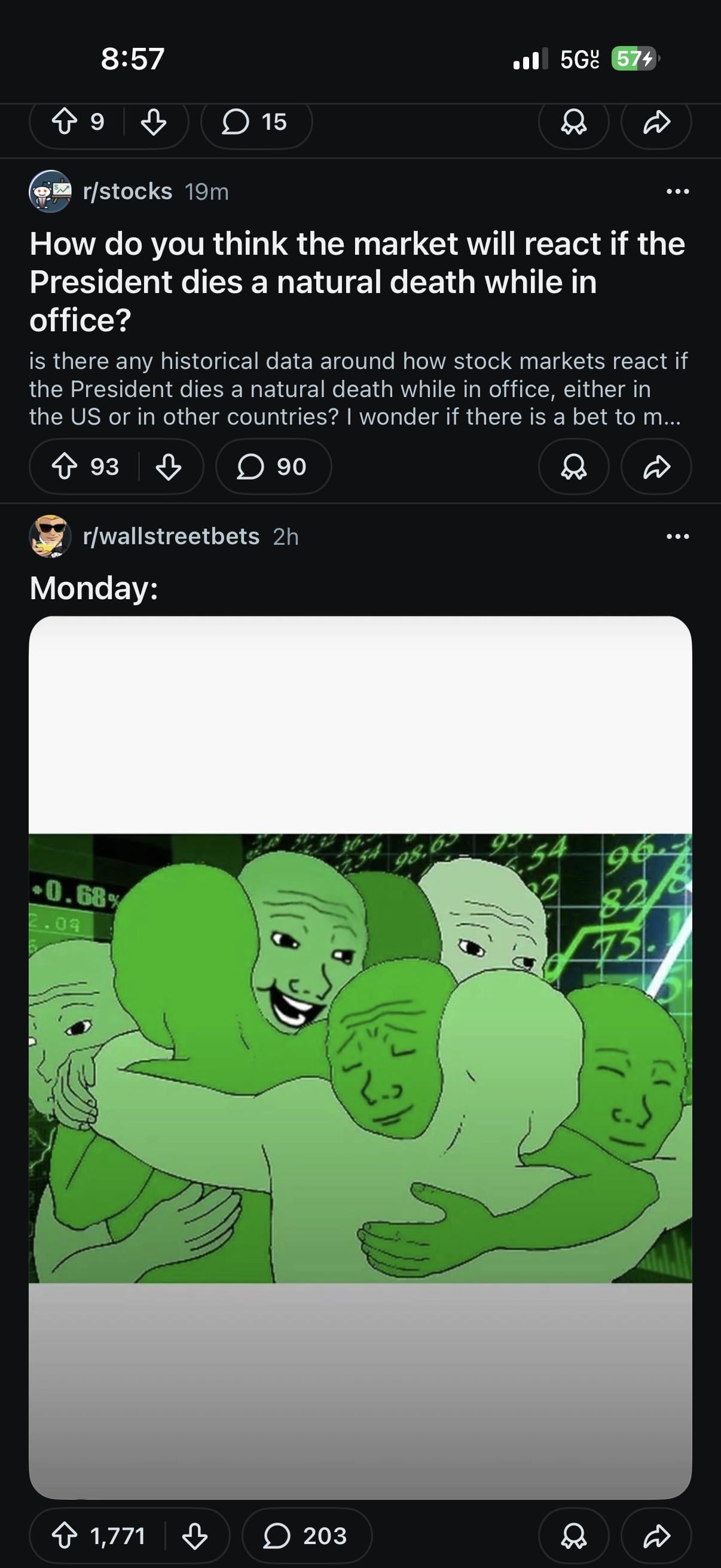 Market’s initial reaction is that the death of a would leader would bring an immeasurable amount of uncertainty and it would go deep red. But then upon further thought, the death of this particular world leader has actually removed a significant source of immeasurable uncertainty, and would then recover and rally hard.