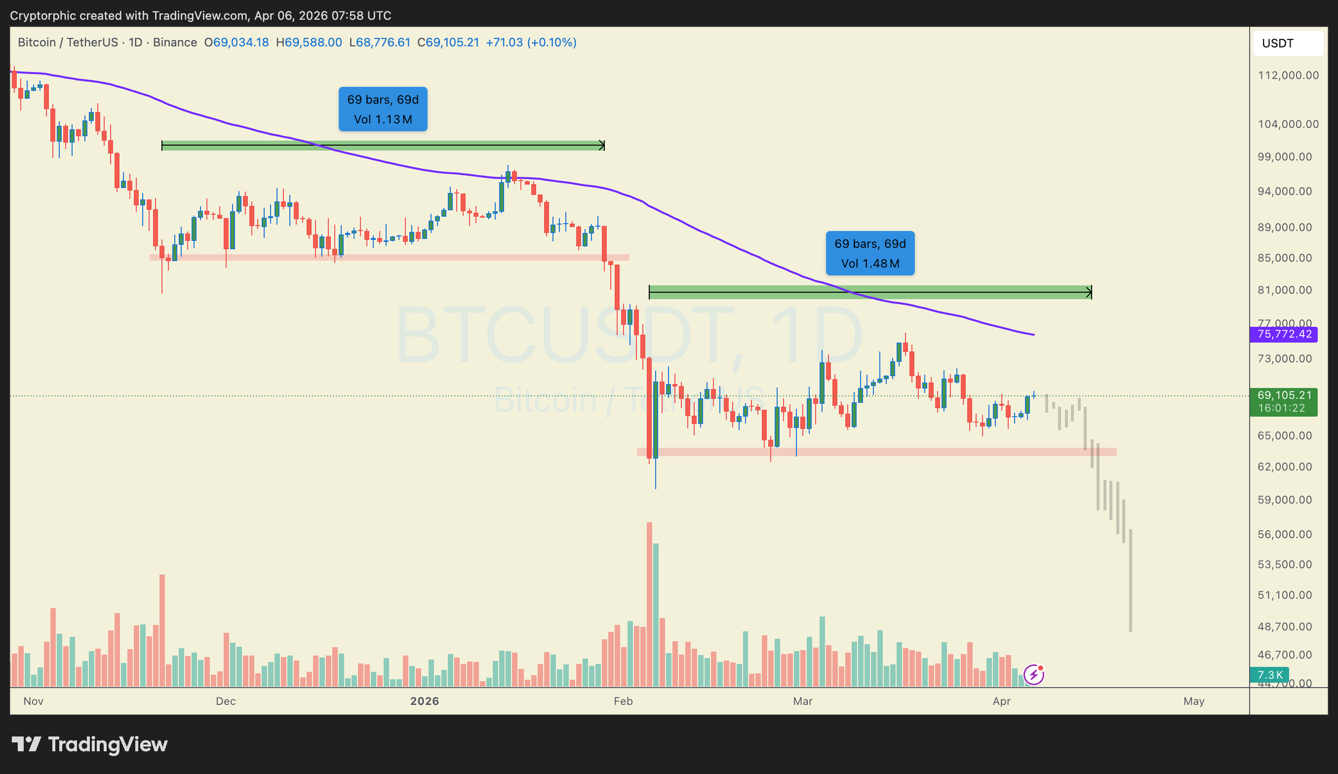 Price is currently hovering around $69K, right in the middle of the range, not showing strong direction yet.