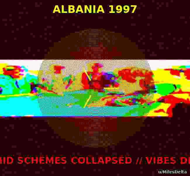 For context: in 1997 two-thirds of Albania’s population lost their life savings in a nationwide pyramid scheme. The government collapsed. The army dissolved. Citizens raided military bases and took the weapons home. These guys said ‘anyway, stripes or solids?’ and used a Kalashnikov as a cue. Most financially literate Balkan investors.