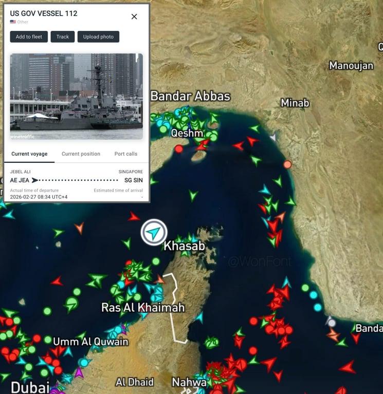 USS Michael Murphy (DDG-112) is seen sailing into the Persian Gulf. The ship showed up on AIS about 5 hours ago.