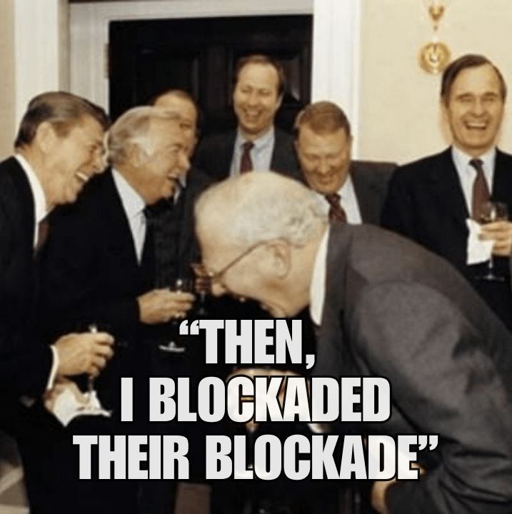 “It’s the most beautiful blockade of any blockade in history. People come up to me… many, many people.. and they say to me, ‘Sir, that is the most beautiful blockade.’ It’s better than Iran’s. Many people are saying it.”