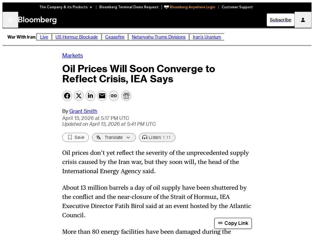 Oil Prices Will Soon Converge to Reflect Crisis, IEA Says https://archive.is/j2zQn Posted by jbochsler
