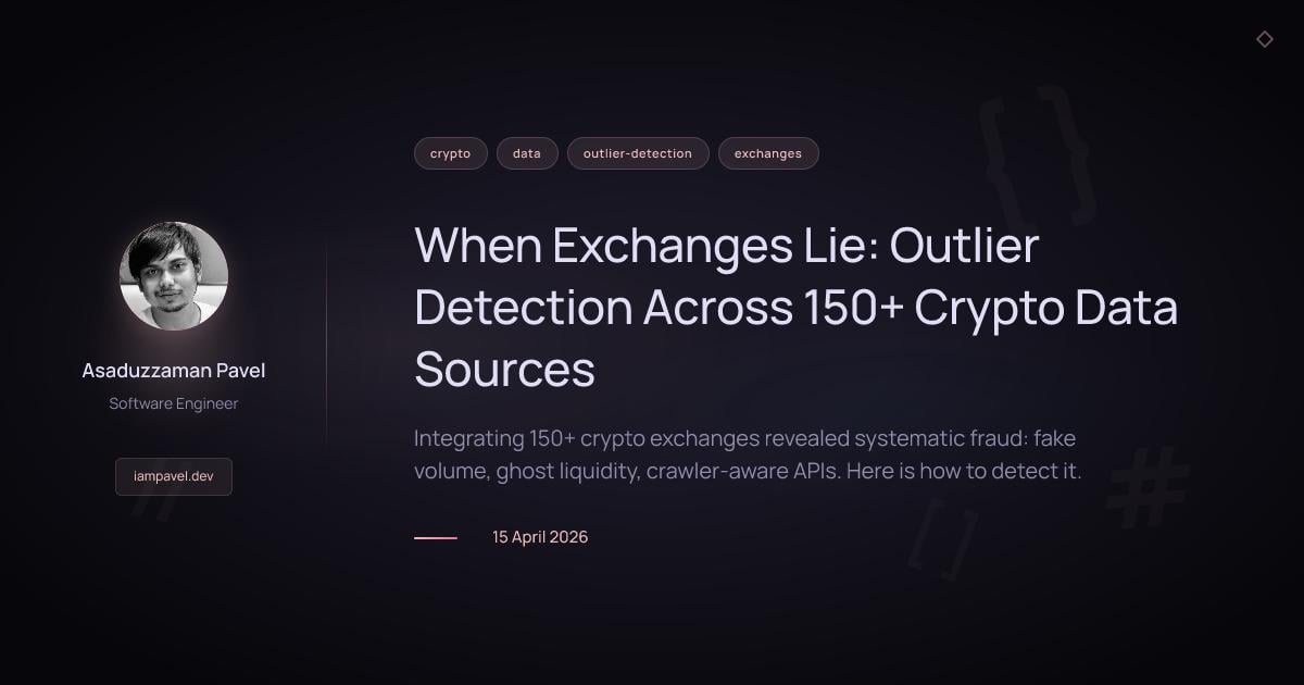 When Exchanges Lie: Outlier Detection Across 150+ Crypto Data Sources https://iampavel.dev/blog/when-exchanges-lie Posted by k1ng4400