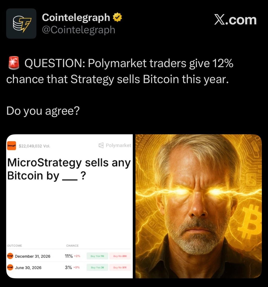 You can put all your money on the under. Mike ain’t selling Bitcoin unless he absolutely has to, and nothing can happen that could even possibly make him have to until 2028 when the first of the converts come due. Sell your organs and bet the under here. Easy money.