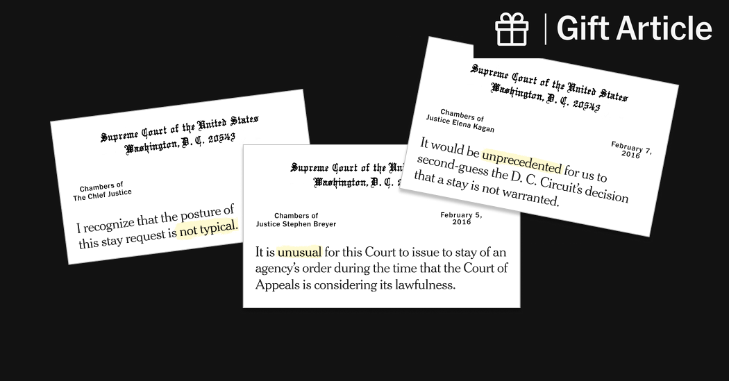 The Inside Story of Five Days That Remade the US Supreme Court | Secret memos obtained by The New York Times illuminate the origins of the court’s now-routine “shadow docket” rulings on presidential power. | By a 5-to-4 vote, Republicans halted President Obama’s Clean Power Plan