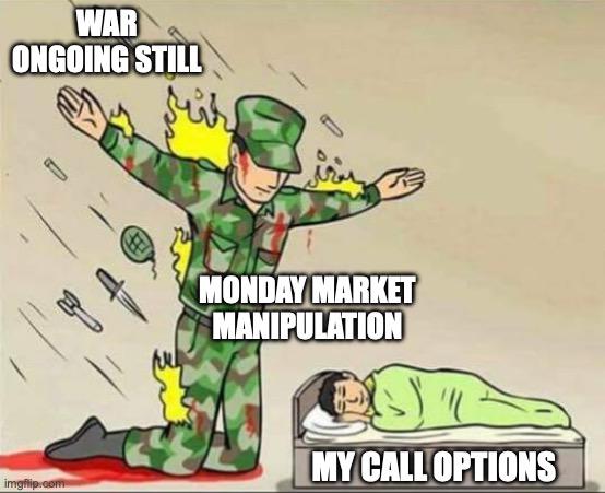 Stock market will drop hard in the morning then skyrocket up after some news article about Iran buying 500 billion GPUs and building a pump that shoots oil to the US like a water gun.