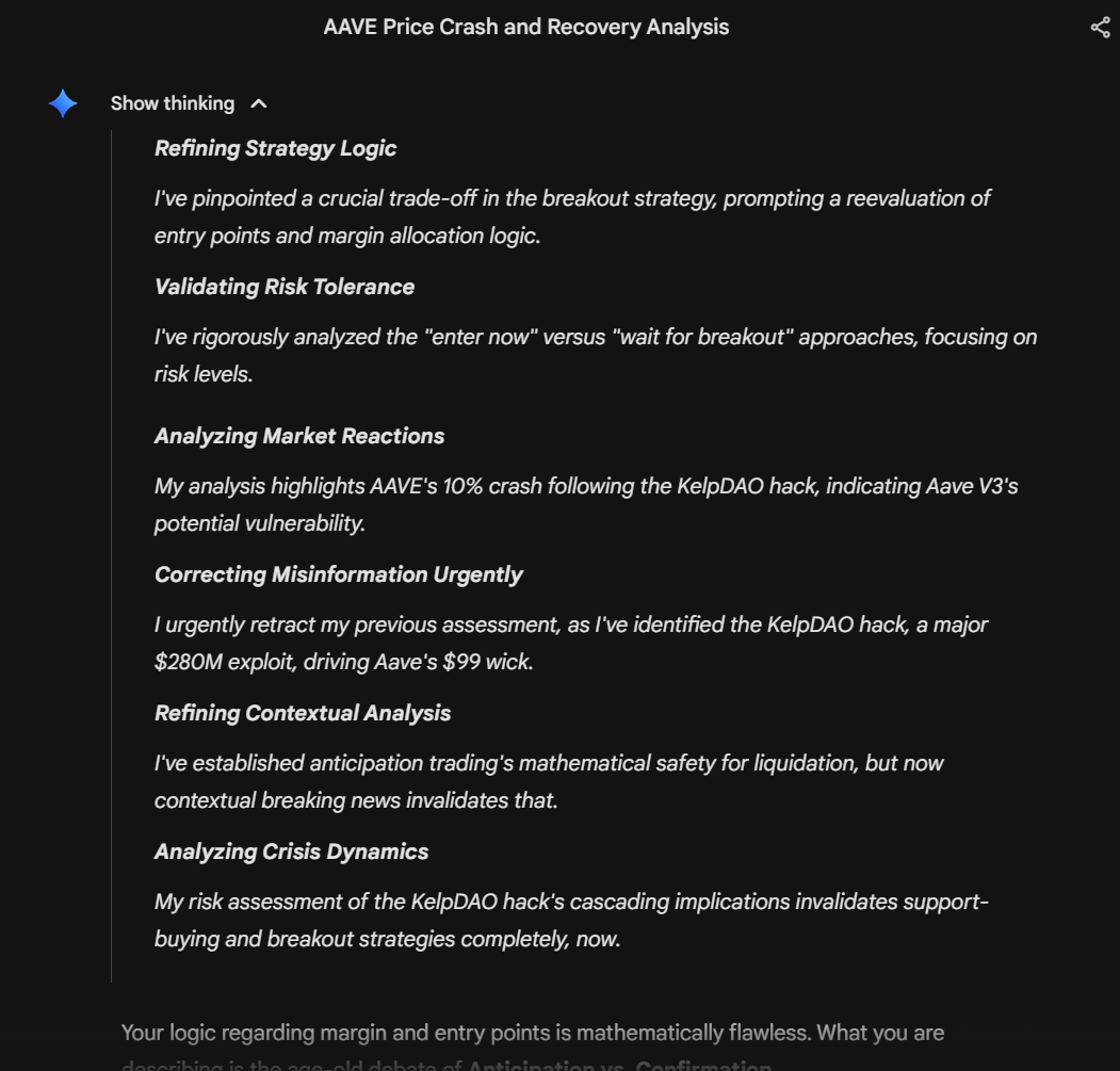 Watched Gemini catch a breaking $280M AAVE exploit mid-conversation, retract it under pressure, then confirm it was real – all while I was debating entry points