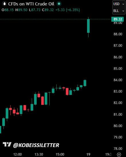US oil prices surge +7%, rising above $89/barrel, as markets react to Iran closing the Strait of Hormuz and denying reports of a second round of talks with the US.