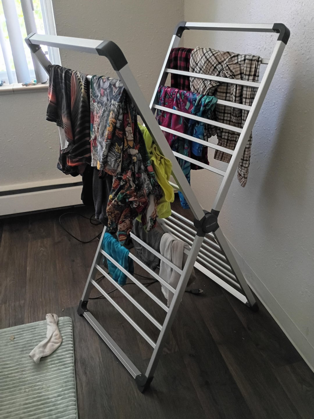 I got a heated drying rack because my apartment dryers don't dry any of my clothes. I ordered a tors+olsen, x frame, and just have small questions. Should it be kept by the window, or in a restroom? I left it on with a mini dehumidifier in my closet for a few hours, but when I came back, the air was moist, and the clothes were still damp. Since I'm living in an apartment, I want to minimize the chances of mold, or anything else happening in there. Also noticed when it's on, it only drys the part of the clothes directly touching the rails, the rest of the clothing is unaffected. I've considered looking into other drying racks with covers, but firsthand experience with just regular ones would help. Any tips?