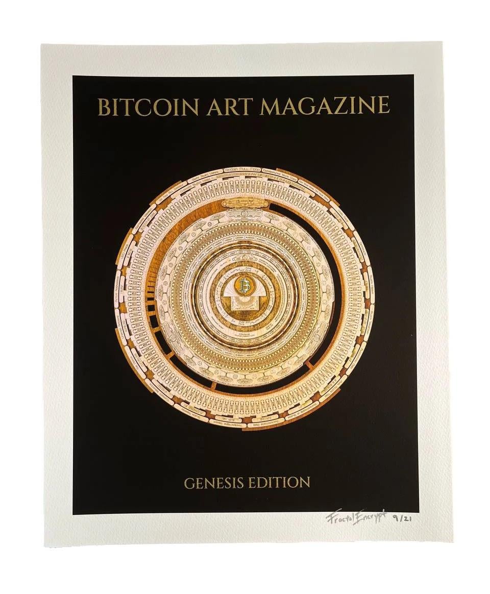 Also included is the following: An archival giclée print with hand-pulled serigraphy text featuring the cover of the Genesis Edition Magazine, hand-signed by FractalEncrypt and numbered 3/21. A 3/21 hand pulled serigraph print from Asanoha featuring his Silk Road Mandala III. Two copies of the Genesis Edition magazine /1720 and one gold-foil cover /210 magazine.