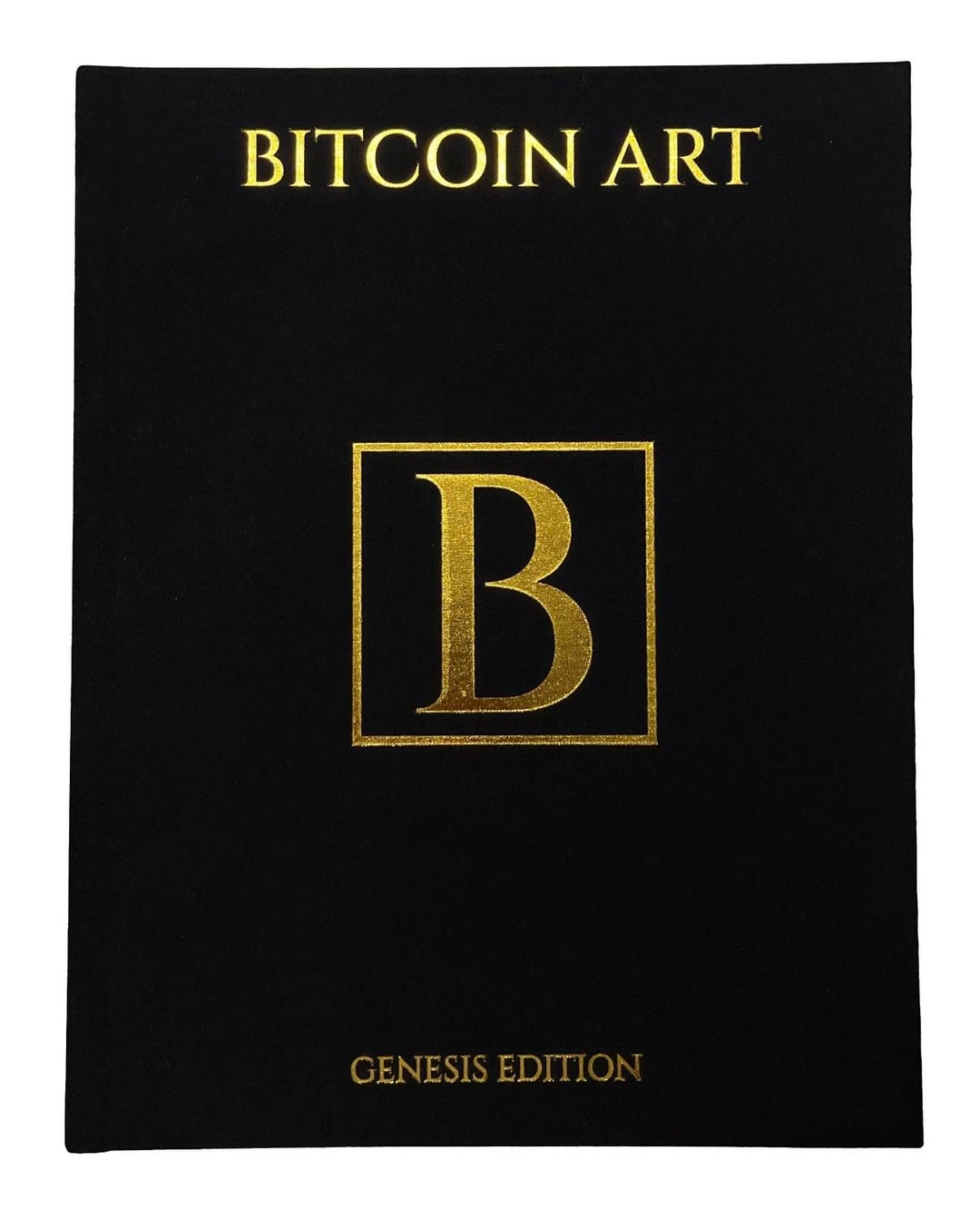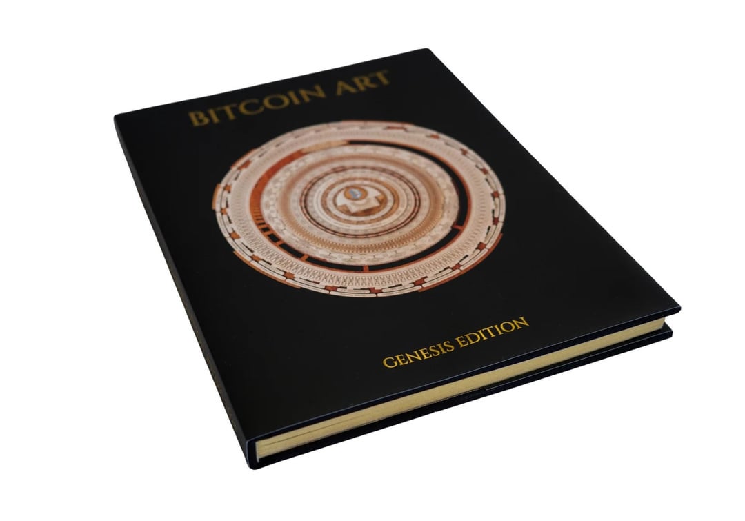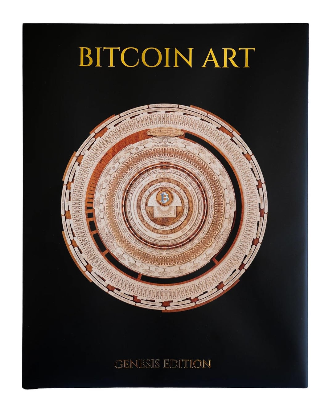 The set includes an LE /21 hardcover fabric bound copy of Bitcoin Art: Genesis Edition with debossed gold foiling, with a gold-foil stamped dust jacket featuring the Genesis Edition cover art of FractalEncrypt's Full Node sculpture. The book is hand-numbered and signed by Asanoha (Founder of Bitcoin Art Magazine) and is accompanied by a custom UV ink Hahnemühle certificate of authenticity.