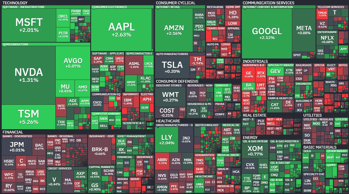 Nasdaq +1.64%, S&P 500 +1.05%, Dow +0.69%.