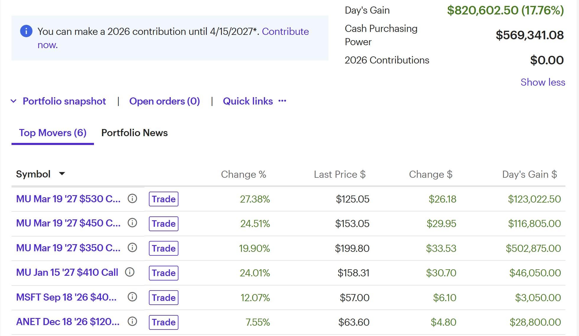 I got these MU leaps that are ITM before the run up to earnings, took a massive hit and then doubled down when it was at $350 a share cashed out like $800K in QQQ and took a leap. Did a YOLO big time. The cash is money from ANET I took off the table. The gains and cash were about where this portfolio was 18 months ago.
