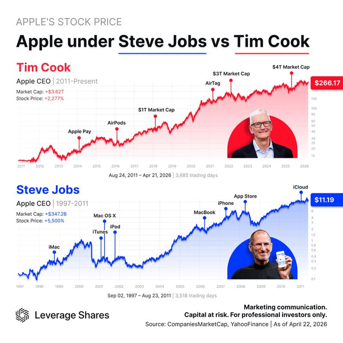 Both Tim Cook and Steve Jobs spent 3,500+ days as Apple CEO and Apple's stock rose more than $1,000% under both.