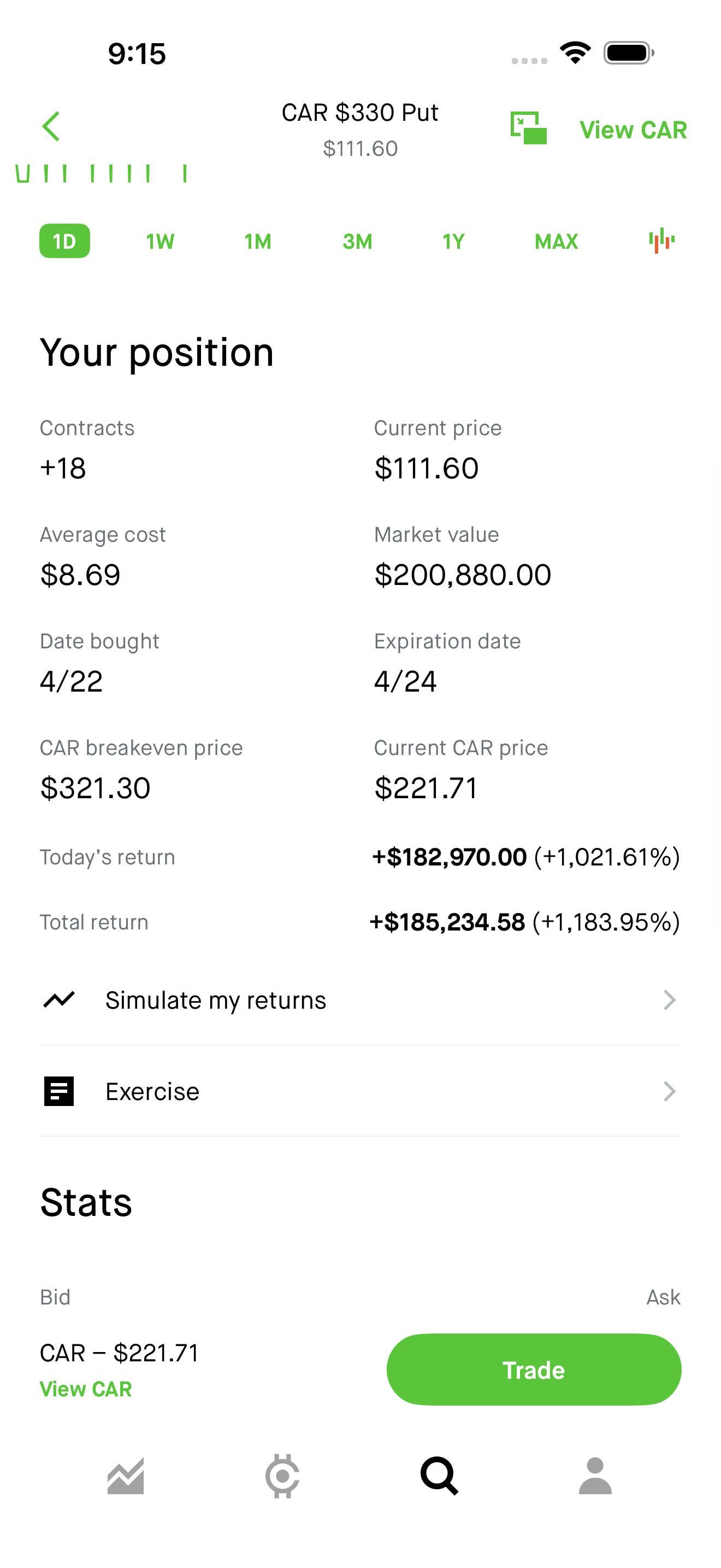 When I saw that $CAR was squeezing for so long, I wondered why people weren't talking about the other side of it, that it would fall for days after it reached the top. I didn't see any reason why not to play it other than losing all my investment money. I didn't catch the first phase, but I bought puts OTM expecting it to crash similarly one day to the next until it became rationally priced. I wish I caught the first phase but I'm so glad to have my first 10 bagger. Also, had a horrible customer experience with Avis once and never again πΉπ»πΎ This is not investment advice π₯²