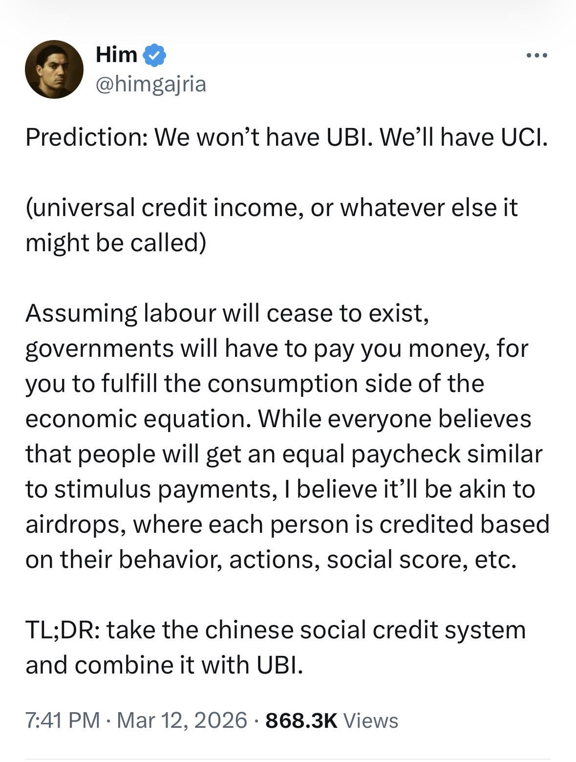 This is pure yap, there is no chinese social credit system, labour isn’t going away and UBI isn’t coming