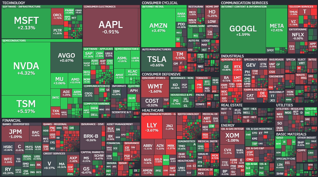 The S&P 500 rose 0.80% (+56.68 points) to close at 7,165.08, the Dow Jones Industrial Average fell 0.16% (-79.61 points) to close at 49,230.71, the Nasdaq Composite surged 1.63% (+398.09 points) to close at 24,836.60, the Russell 2000 rose 0.43% to 2,787.00. The VIX fell 3.57% to 18.62. Bitcoin slipped 0.42% to $77,575.29. Gold was nearly flat, edging up 0.06% to $4,726.60. Crude oil fell 0.79% to $95.09 per barrel. In dollar terms, the broader market gained an estimated $120–150 billion in value.