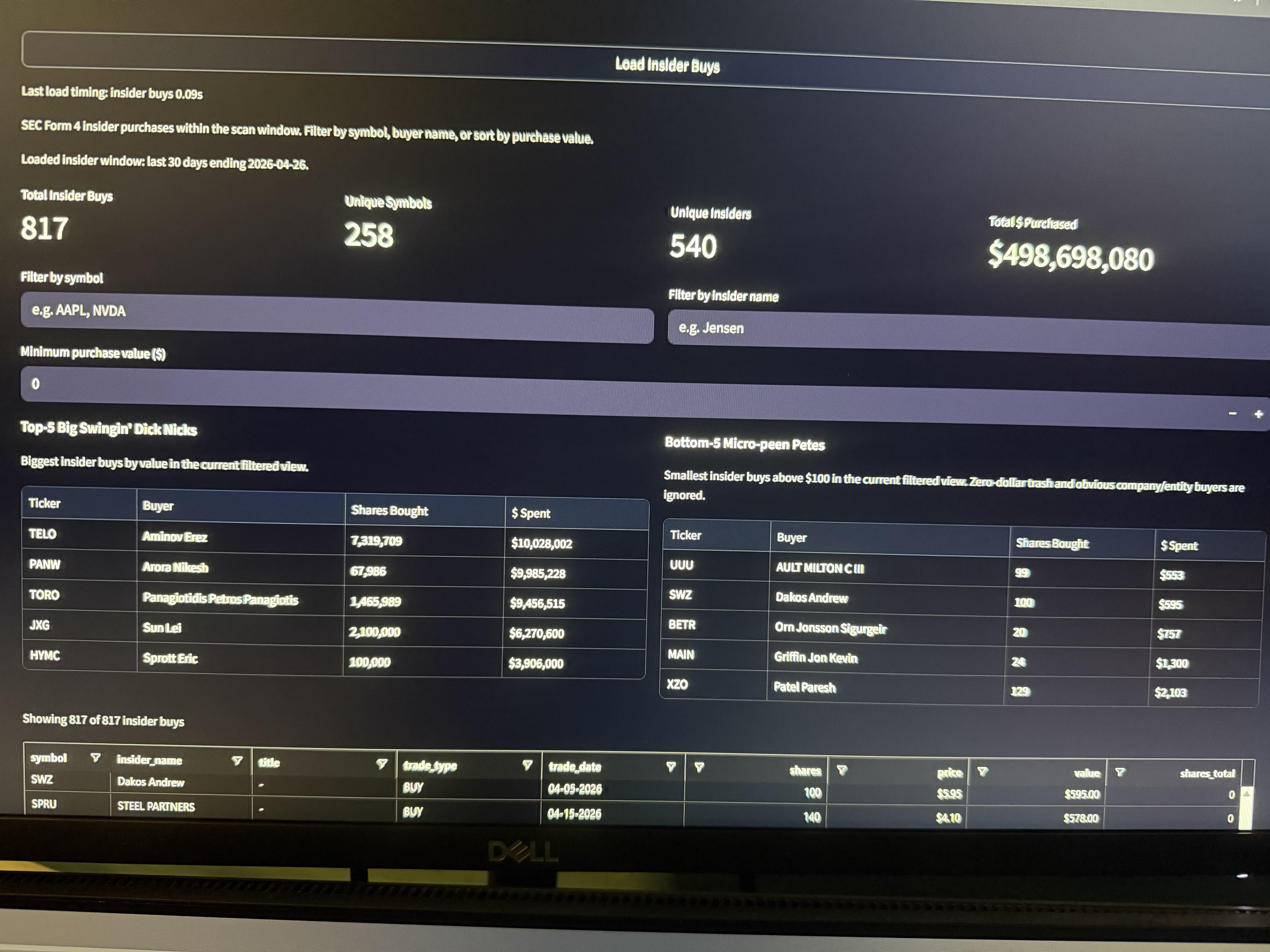 So I’m building an app for myself that tracks a bunch of shit, but one thing I added to it for my own amusement was to track the top 5 biggest insider buys and call them “Big Swingin’ Dick Nicks” and the insiders that bought the least amount and call them “Micro-peen Petes”