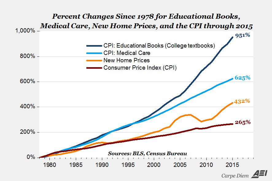 Between 1978 and 2015, the price of college textbooks exploded by almost 1000%, far exceeding inflation even for healthcare and housing, and far exceeding general inflation (265%). College textbook price inflation is the most severe inflation that any physical item has suffered over the past 50 yrs.