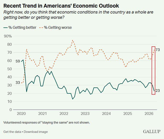 Currently, 73% of Americans believe the economy is getting worse, the highest since May 2023, while only 23% believe it is getting better.