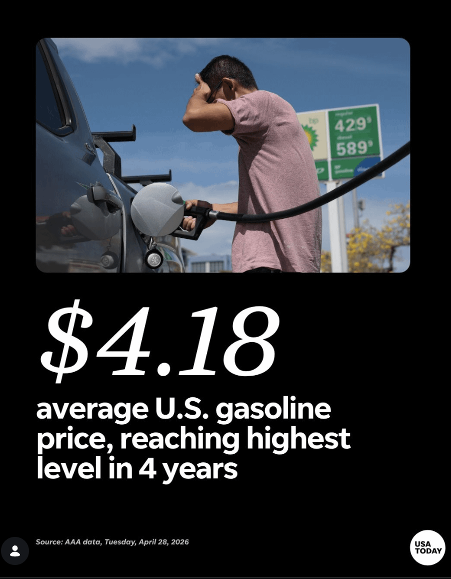 Average gasoline prices rose to $4.18 a gallon on Tuesday, according to AAA data, reaching their highest level since the early days of the Russia-Ukraine war in 2022.