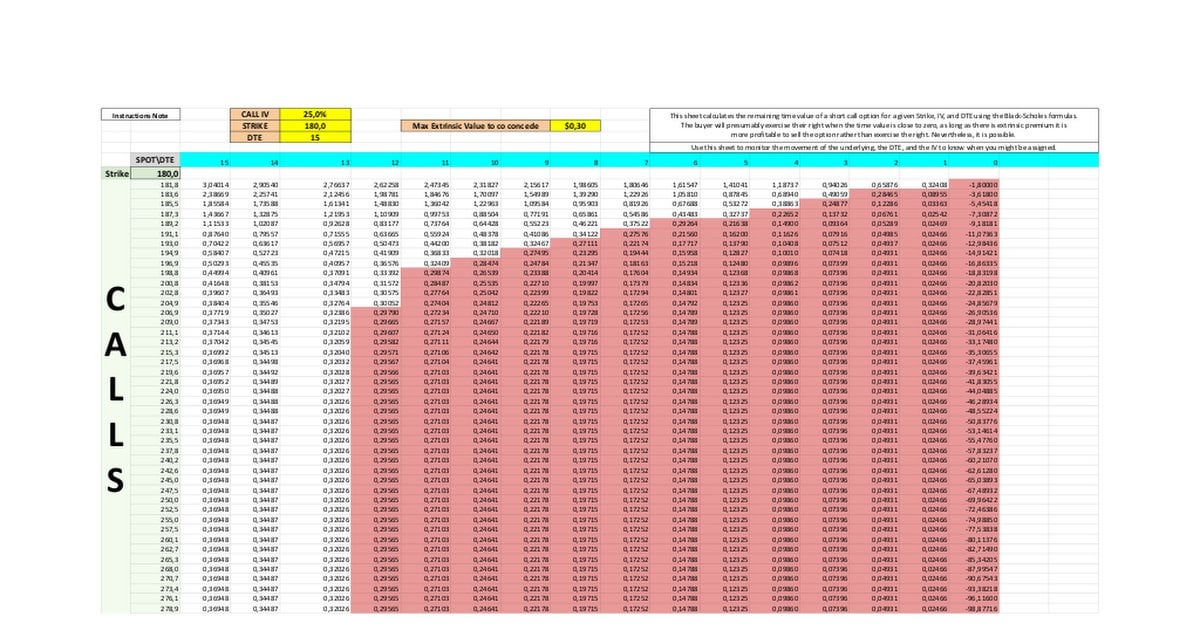 This sheet calculates the remaining time value of a short option for a given Strike, IV, and DTE using the Black-Scholes formulas (No dividends)